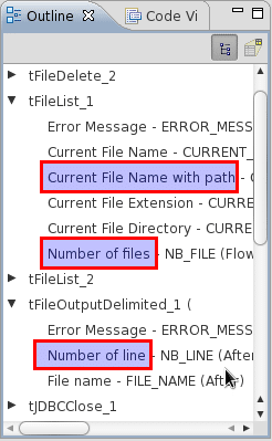 Atenção: Tome o cuidado de observar o nome único do componente na view Outline, neste job temos por exemplo os componentes tFileList_1 e tFileList_2. Você pode obter o nome único do componente clicando no mesmo e olhando o cabeçalho da view Component.