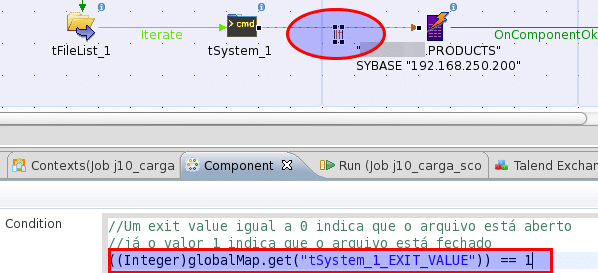 E para garantir que sejam carregados apenas os arquivos fechados, conectamos o componente tSystem ao tSybaseIQBulkExec utilizando a trigger If, onde poderemos especificar uma condição para execução do componente sucessor. Como condição utilizamos o retorno do componente tSystem, que caso seja igual a 1 indica que o arquivo atual não foi listado, ou seja, não está aberto por nenhum processo e então podemos carregá-lo.