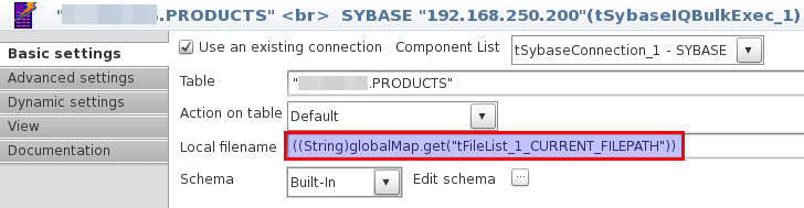 Então utilizamos o componente BulkExec da tecnologia destino, aqui um Sybase IQ, para carregar o arquivo do loop atual. Neste componente você define o schema da tabela destino e aponta para o arquivo a ser carregado, mais uma vez obtendo o nome do arquivo e caminho listado no tFileList através da view Outline.