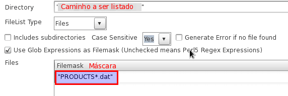 Estamos listando o conteúdo do diretório onde o componente tFileOutputDelimited está criando arquivos, então definimos uma máscara com o formato de nome que esperamos para estes arquivos, neste caso “PRODUCTS*.dat”, onde * é um caractere curinga onde esperamos a sequència de números que o tFileOutputDelimited irá inserir na criação dos arquivos.
