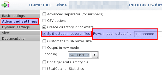 E como modo de armazenamento intermediário destes dados obtidos do database de origem utilizamos arquivo(s) de texto puro. Neste caso utilizaríamos normalmente um componente OutputBulk, mas ao invés disso utilizamos um componente tFileOutputDelimited, que no fim das contas tem o mesmo propósito: gerar um arquivo de texto puro, mas além disso possui uma opção interessante: na guia Advanced do componente ativamos a opção Split output in several files que fará surgir uma outra opção chamada Rows in each output file, com estas opções especificamos que o conjunto de registros obtidos da fonte deverá ser dividido em vários arquivos com um número máximo de registros, cujo valor é definido por você. Neste caso defini um limite de 100 milhões de registros por arquivo. Assim teremos vários arquivos com o nome PRODUCTS1.dat, PRODUCTS2.dat…