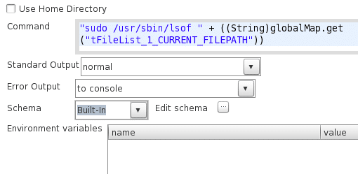 Através do componente tSystem executamos comandos do sistema, independente do sistema onde o job está sendo executado, Windows, Linux, FreeBSD… quem sabe outros.. E neste especificamente executamos um comando pertencente a sistemas Unix e similares: o lsof, que lista os arquivos abertos no momento por algum processo.