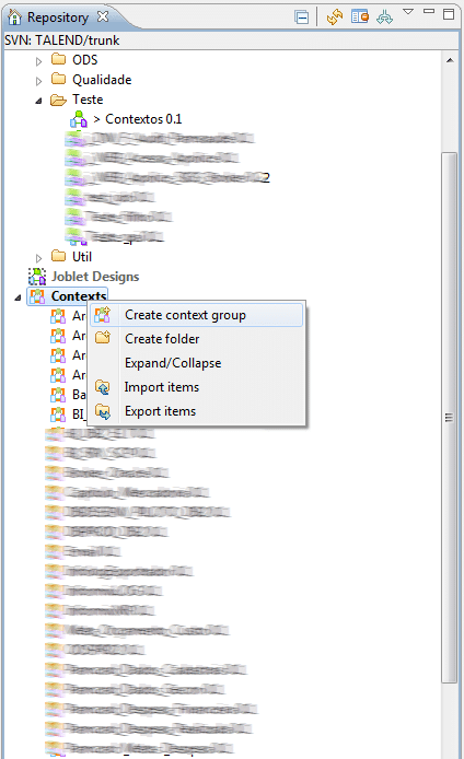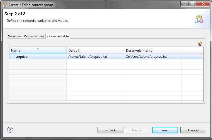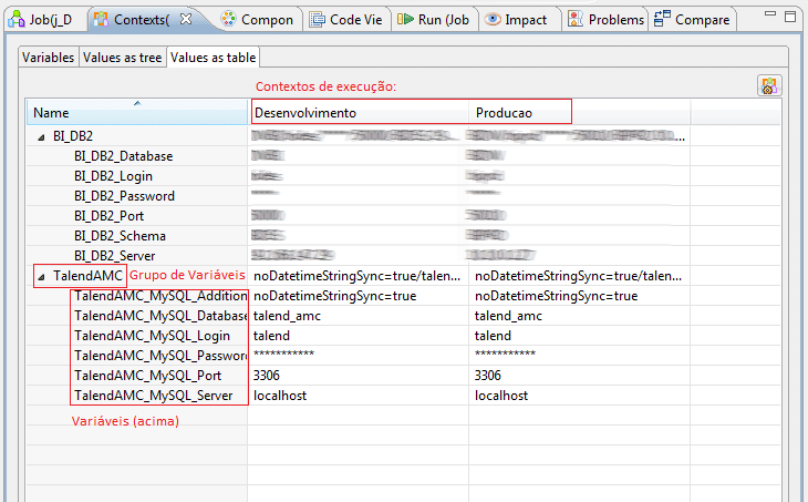 Se você importar um grupo de variáveis cujos contextos de execução são “Servidor A” e “Servidor B” e outro grupo de variáveis cujos contextos de execução são “Desenvolvimento” e “Producao”, não haverá como o Talend compreender em qual contexto executar o job, pois ele terá 4 contextos de execução diferentes.