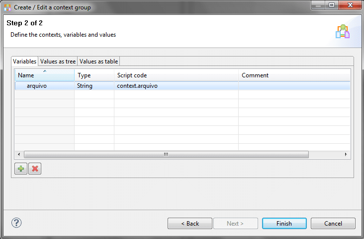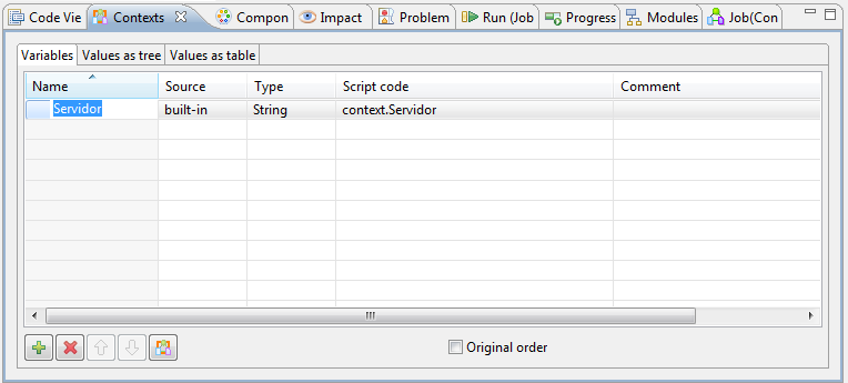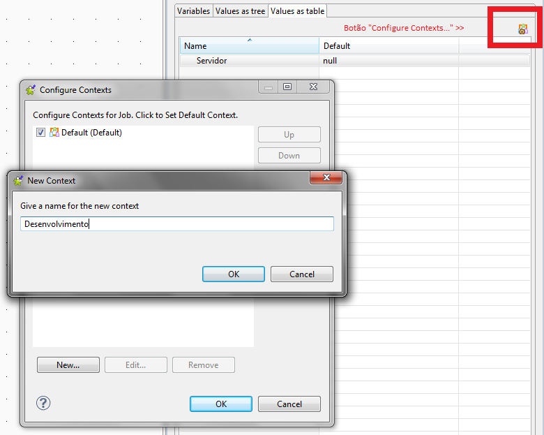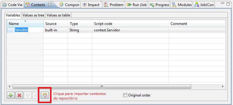 Para começar, vamos criar um job e definir uma variável de contexto chamada “Servidor“, do tipo String – vá até a aba Contexts e clique no ícone com um “+”: