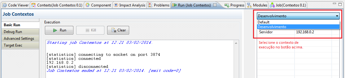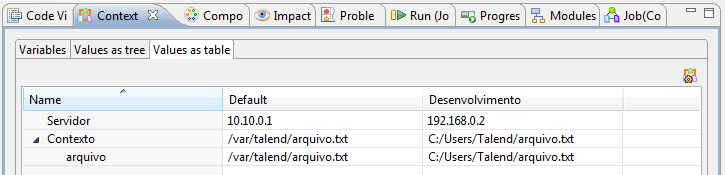 Você pode ter tantas variáveis e grupos de variáveis dentro de um job quanto forem necessários. Mas sejam eles importados do repositório ou locais, os nomes de seus contextos de execução deverão coincidir – só assim o Talend poderá compreender em qual contexto executar o job. Observe na imagem anterior: tanto a variável local “Servidor” quanto o grupo denominado “Contexto” possuem dois contextos de execução iguais: Default e Desenvolvimento.